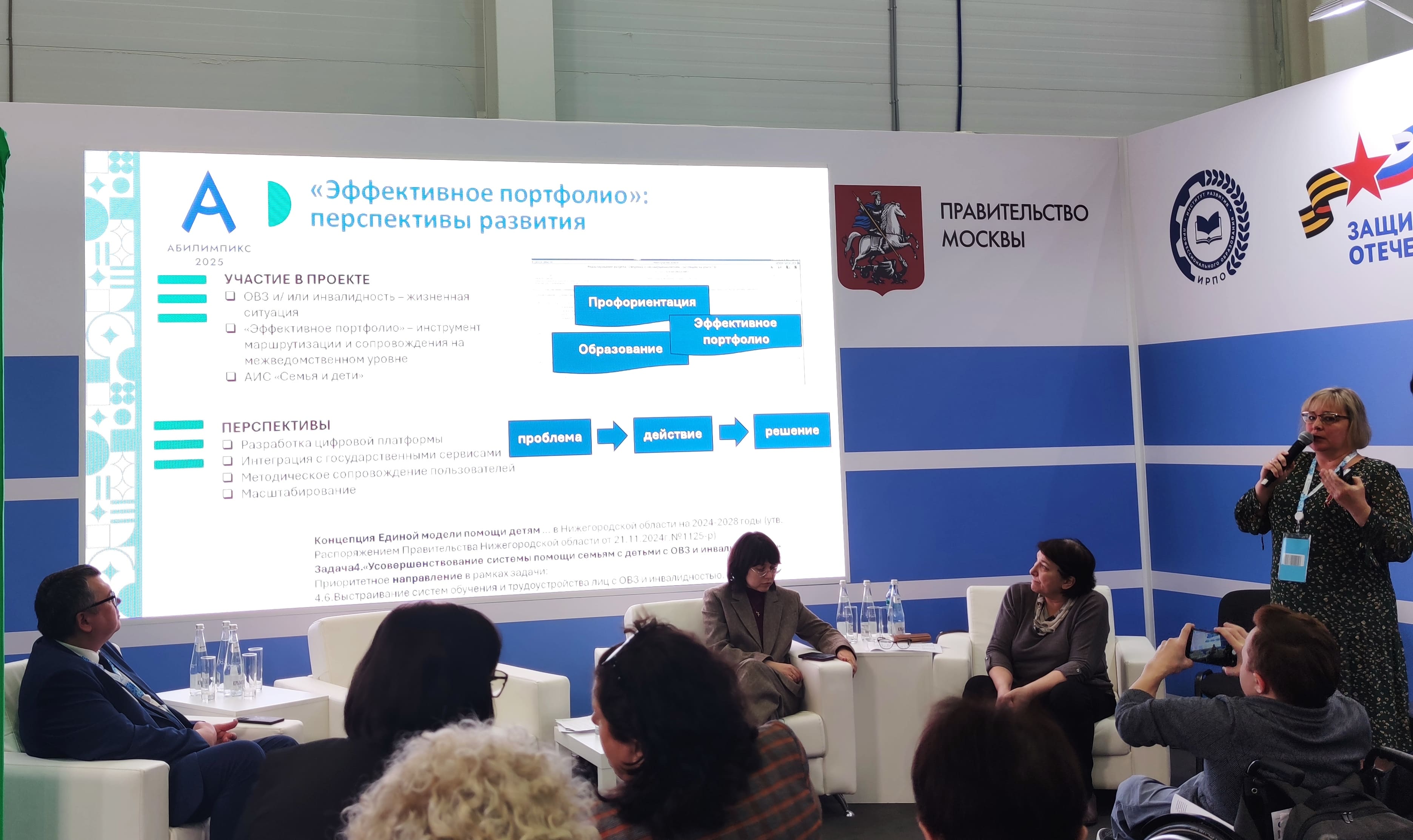 Следующий спикер Юлия Михайловна Домра рассказала о построении системы среднего профессионального образования Сахалинской области. Юлия Михайловна поделилась историей и результатами участия ребят с интеллектуальными нарушениями сначала в фестивале профессий и затем чемпионате «Абилимпикс».